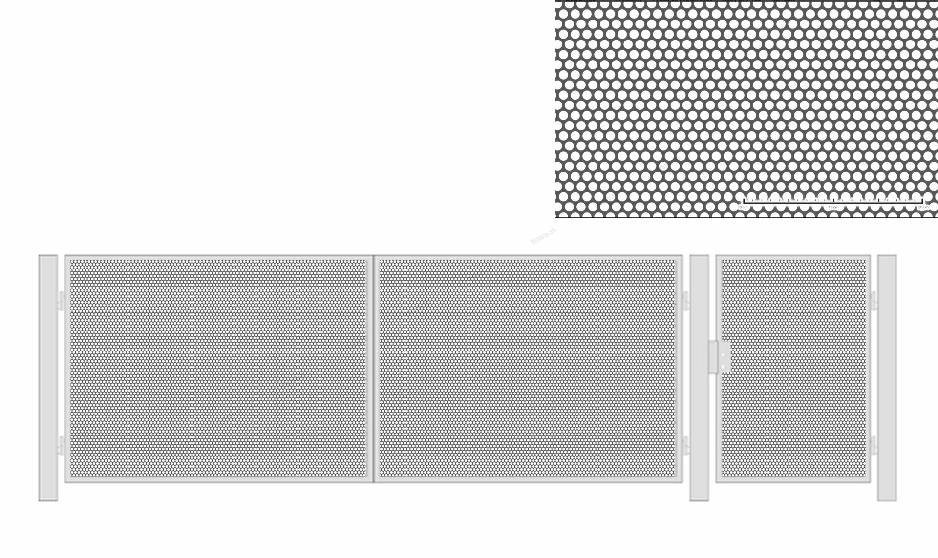 Bránovú sestavu z děrovaného plechu typu PP RV10-13 / 1 tvoří dvoukřídlá brána jejíž šířka je 4700 mm a otevírací branka o šířce 1000 mm, nosné sloupky, zámek a klika. Všechny součásti jsou zhotoveny z kvalitního kovu. Výplň sestavy je ošetřena práškovou úpravou a pozinkovaná, přičemž rám je vypískován a popráškovaného. Děrování je kruhové s velikostí otvoru 10 mm a rozteč mezi otvory je 13 mm. Tloušťka plechu je 1 mm. Pro správné vyřízení Vaší objednávky uveďte do poznámky typ otevírání branky, viz obr.2. Ke každé dvoukřídlých bráně lze doobjednat automatický pohon s komplet příslušenstvím. Sloupky k vratové sestavě jsou grátis!